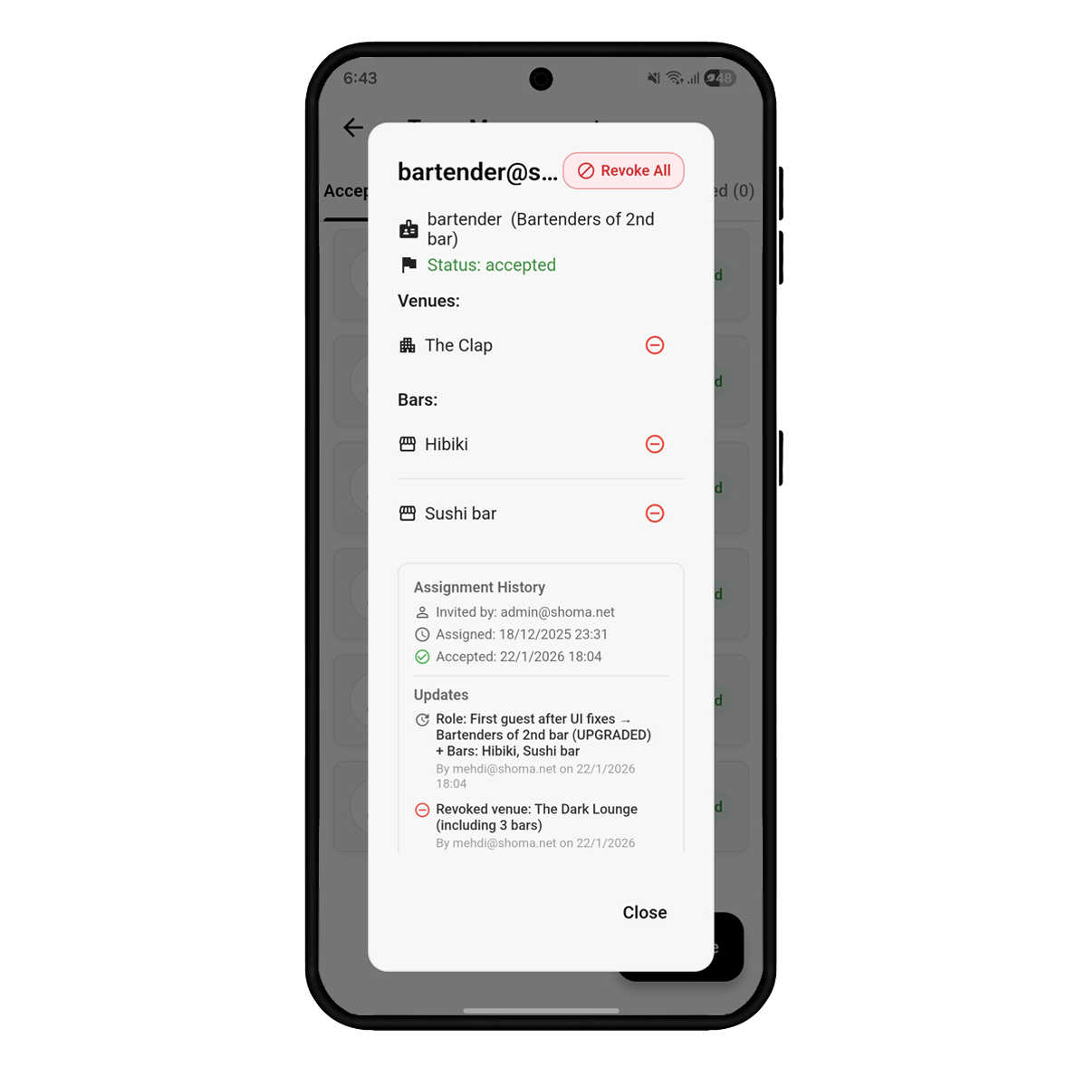 - Multi-venue ready – Venues, bars, roles, permissions